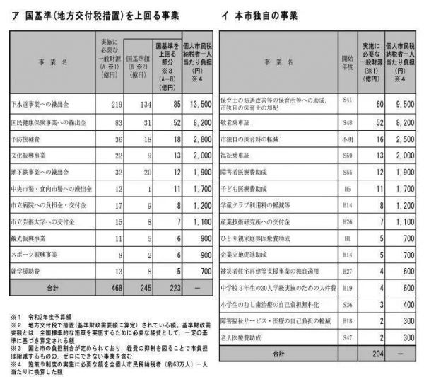 公务员和公立机构雇员要裁撤,各种开支要缩减,不过如果只是列数字,也只是让大部分看的市民一头雾水而已,所以,把数字讲清楚也是公文中应有的责任。比如公共财政雇佣的职员数,京都市相比其他都市,根据人口换算得来的数字,要多出大约500人。而政府雇员的开支也按照人口换算了一番,结果是比其他都市多了171亿日元,是收支失衡的原因之一。如此,政府裁撤雇员的目标也就清晰起来。