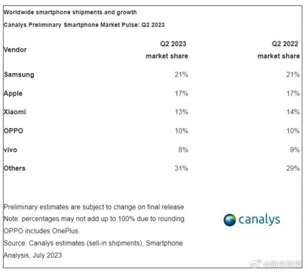机构Canalys最新报告显示,2023年二季度,全球份额前五的手机厂商,基本没有变化:三星趁苹果淡季与其拉开差距,稳稳第一;20%份额以下,依次是苹果、小米和OV。同比来看,三星、苹果、OPPO的份额基本不变,小米、Vivo相对掉了1%。这与Counterpoint统计差不离。