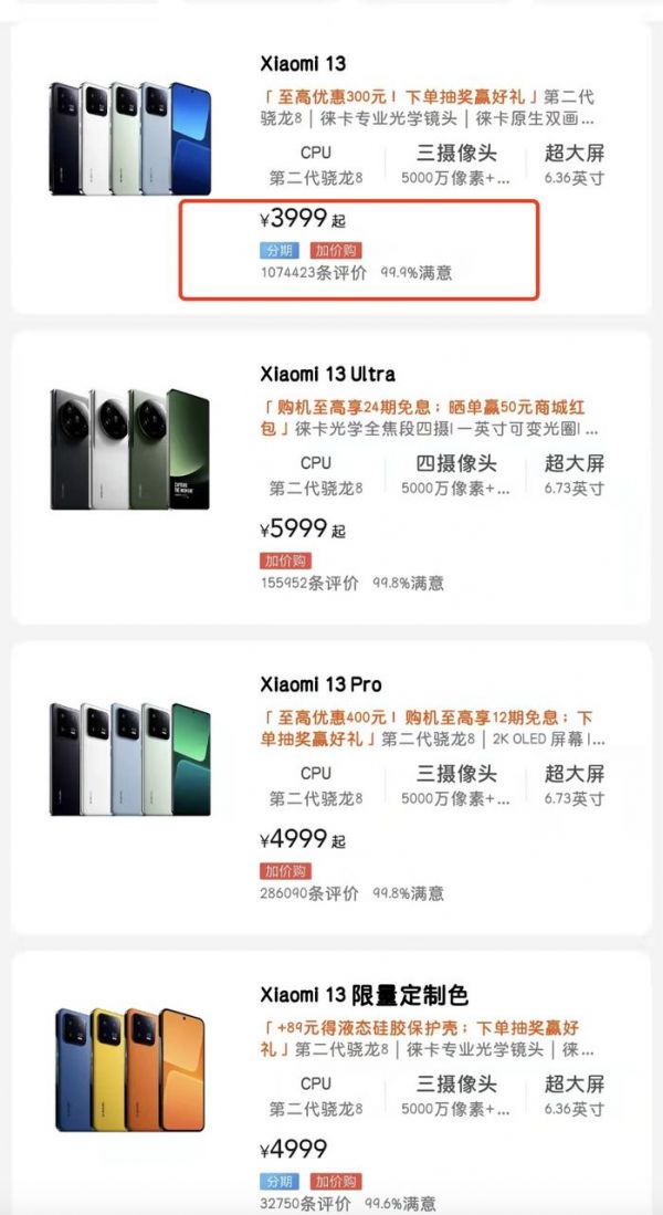 另一份证据来自电商平台数据,小米13在618期间成某东4~6K价位段销量前三名,累计评价突破20万条,小米商城评价突破100万条。按照评价与销售数量1:3计算,小米13单款手机销量至少在300万台以上,这个成绩足以与华为Mate50、P60相提并论,小米高端梦终于成功。