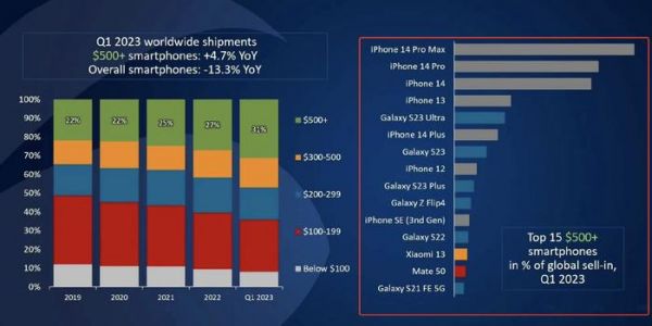 从2020年开始,国产品牌集体宣布冲击高端市场,三年时间过去谁成功了呢?Canalys公布一份数据显示,2023年一季度全球高端智能手机(500美元及以上)榜单中,只有小米13、华为Mate50两款国产手机入围,说明经过三年时间奋发图强,只有小米可以与华为旗舰机一较高下。