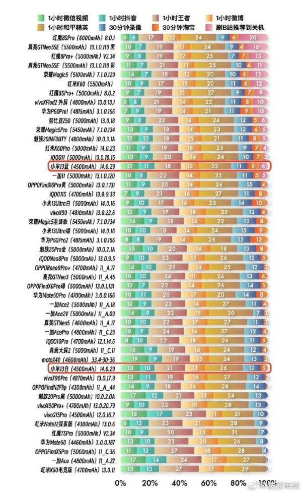 为了验证事实真相,有博主亲自测试重度使用半年小米13手机,发现续航表现只比新机衰减半个小时,没有像某些人说的那样续航尿崩。