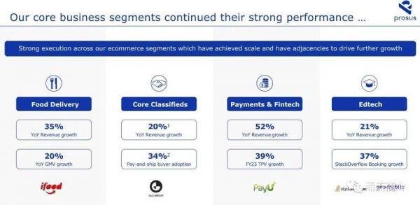 业绩会上,Prosus首席执行官Bobvan Dijk表扬这一业务板块:“每个核心细分市场都实现了20%~50%的增长。食品配送收入增长领先于同行,盈利能力大幅提高。”