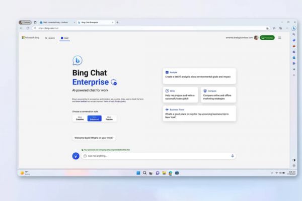 同时,浏览器上的人工智能助手 Bing Chat,在普通消费者用户中打开市场后,现在将推出面向商业用户版本的 Bing Chat Enterprise,聚焦在给予商业用户更好的数据保护。