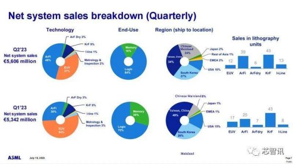 从具体的收入来源看,按设备技术划分,ASML二季度来自ArFi设备(浸没式DUV光刻设备)的营收占比为49%,相比今年一季度增长了高达19个百分点。EUV设备的营收占比为37%,相比今年一季度降低了17个百分点。这或许与一季度ASML披露,除NXT:1980系列外,其他浸没式DUV光刻机将受荷兰政府出口管制有关。