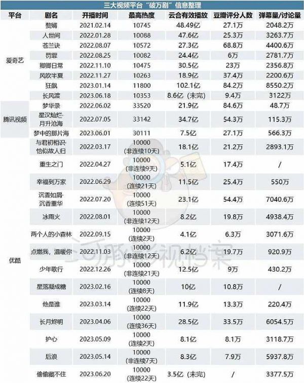 “平台是不会随意对自己的热度值算法做调整的。”制片人叶子表示,虽然2022年破万剧大增,却并不属于平台的算法调整,“对平台来说,算法调整是一件非常大的事,以优爱腾覆盖的用户量级来说,一旦频繁调整算法而动摇了用户的信任度,负面影响会非常大,而且从成本投入来说也得不偿失。除了优酷做过一次调整之外,爱奇艺2023年的破万剧数量暂时只有2部,也只可能是因为其内容在今年的创新度或许还不足。”