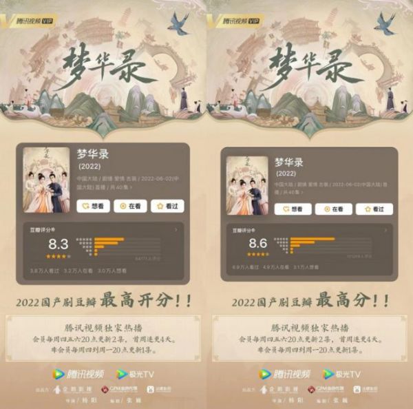 在去年《梦华录》作为古装剧,开播后豆瓣评分一度奔向9分、后又锁分降分的一系列操作后,网友就对豆瓣数据是否有人为操作成本产生过质疑。