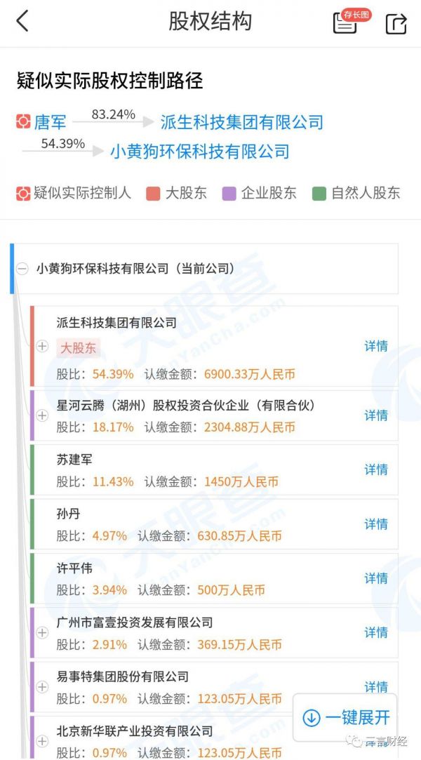 天眼查资料显示,小黄狗环保科技有限公司于2017年8月成立,是派生科技集团有限公司旗下全资子公司,注册资本1亿元,公司主营智能垃圾分类回收业务,实际控制人为唐军。