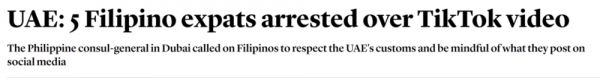 2023年3月,5名菲律宾侨民因在TikTok上发布不雅视频在沙迦被逮捕,视频中他们假装低价“出售”自己的同伴,他们表示“只是为了好玩”,但被当局认为是宣传不道德行为。