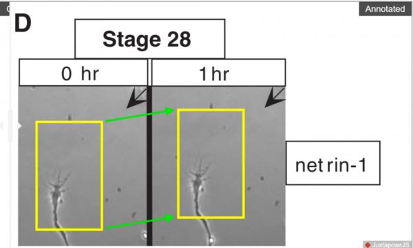 其次,Bik发现Tessier-Lavigne在Science杂志发表的一篇一作论文中有两张显示轴突生长过程的图片,这两张图像分别代表轴突生长中的不同阶段,然而第二张图像似乎是第一张图像的移位版本。(见上图)