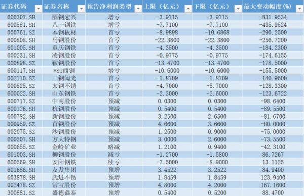 净利润亏损预减幅度较大的是酒钢宏兴(600307.SH),业绩预告显示,公司预计上半年实现归属于上市公司股东的净利润-3.97亿元,去年同期为-4261.48万元,同比下降约831%。