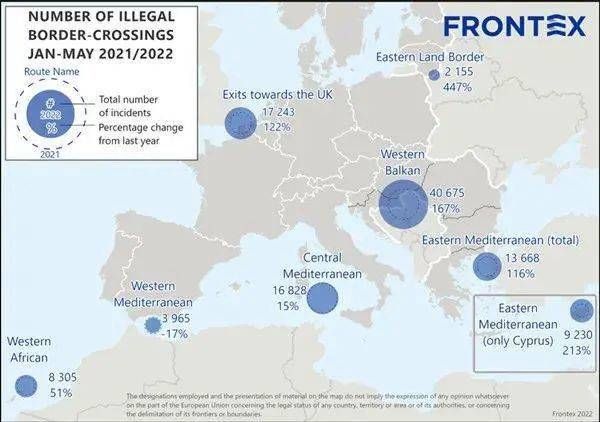 按照欧洲边境管理局的数据,2022年,欧盟国家记录到的非法移民或者难民数量约为33万人,这个数据比2021年增加了64%,是2016年以来的最高值。