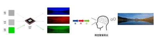 在单片DLP投影仪中,光源发出的白光通过转动的色轮被过滤为红、绿、蓝三原色中的一种,随后依次投射到DMD芯片并被反射出去,形成某一色彩的单色画面。这些单色画面之间有着微小的时间差,但短时间将多幅单色画面叠加在一起,就可以利用人眼的视觉残留效果形成彩色图像。