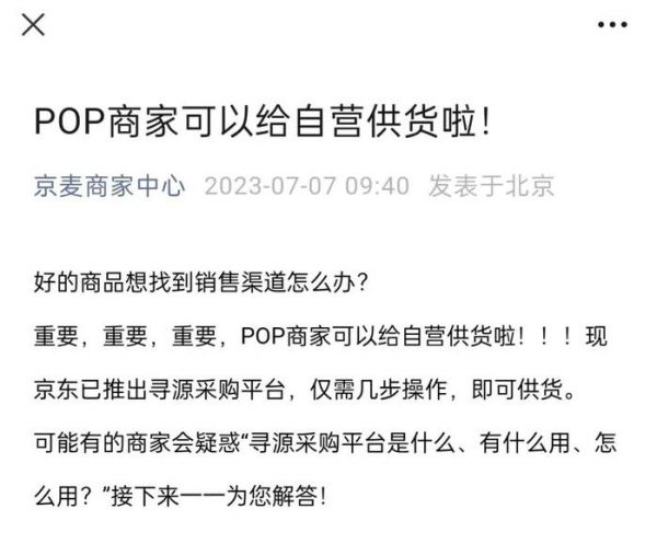 正如京麦商家中心给“寻源采购平台”树立的价值:“好的商品想找到销售渠道”。对于第三方卖家而言,即使平台给予的扶持再多,京东自营自带的“隐性流量”,也决定了其始终是京东最重要的销售渠道。