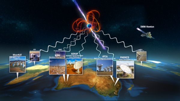 新信号是由默奇森大视场射电阵(MWA)发现的,全球各地的许多其他望远镜也加入了确认这一发现并研究该天体的行列。(图/SARAO/Daniel López/IAC/Marianne Annereau/NCRA/CSIRO/Dragonfly Media/AUI/NRAO/ESA)