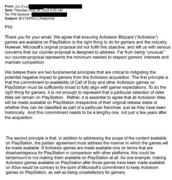这份合作协议的条件远远低于去年微软主动向索尼提出的那份。去年5月,为了获得索尼认可交易,微软游戏业务负责人斯宾塞主动向索尼游戏业务负责人瑞恩发送邮件,建议双方进行合作谈判。斯宾塞在邮件中详细列出了收购完成之后,继续会在PS平台上推出的动视暴雪游戏列表,其中包括了大部分热门游戏。