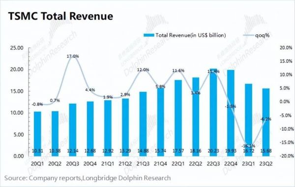 台积电(TSMC)于北京时间2023年7月20日下午的长桥美股盘前发布了2023年第二季度财报(截至2023年6月),要点如下: