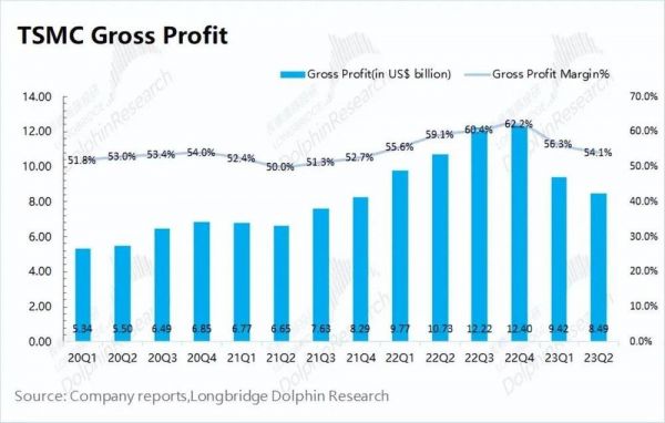 2023Q2台积电的毛利率54.1%,环比下降2.2pct。虽然毛利率好于市场预期的53.3%,但较此前60%以上的情况有明显的回落。