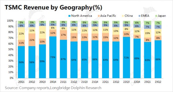 从各地区收入来看,北美地区仍是台积电最大的收入来源。这是由于北美地区有苹果、高通、英伟达、AMD等大客户,使得台积电和美国之间有很强的商业绑定关系。本次财报中,北美地区的收入占比有所回升,这主要是因为公司美股的部分大客户在本季度新增了订单。