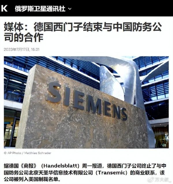 近日,俄罗斯媒体原因德国媒体的报道称,德国西门子终止了与北京天圣华的合作关系,理由是天圣华被美国列入制裁名单。