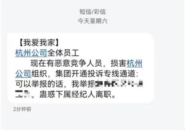 7月8日,我爱我家总部收到了杭州中介的举报短信。短信中提到“我举报XX区区经理XX,蛊惑下属经纪人离职”。