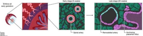 胎盘是连接母亲和胎儿的桥梁,母体与胎盘细胞共同为胎儿提供生命支持。胎盘形成过程中,胎盘细胞会逐渐侵入母体的子宫壁,重塑母体的子宫动脉,以便为胎儿供血。子宫动脉重塑是成功妊娠的关键事件。