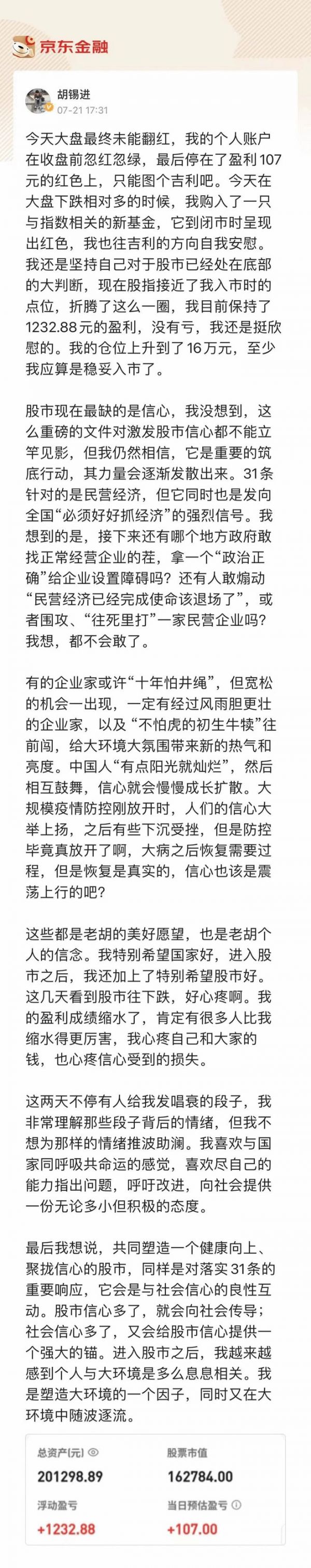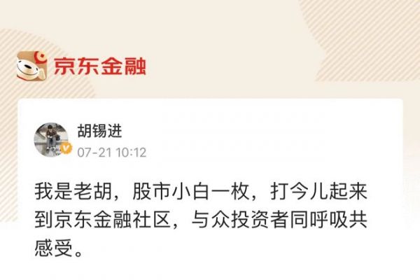7月21日消息,今日,资深媒体人胡锡进发文称正式入驻京东金融社区,这是继雪球后,胡锡进入驻的第二个专业金融社区。