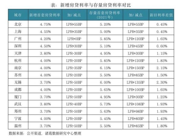 诸葛数据研究中心监测数据显示,重点15城当前新增首套房贷利率均降至5%以下水平,最低降至3.7%,而存量首套房贷利率基本都在5%以上,其中南京、无锡甚至高达6%以上,杭州、南京、无锡、武汉等城市LPR加点超过100BP,新旧利率差最高达到2.3%。