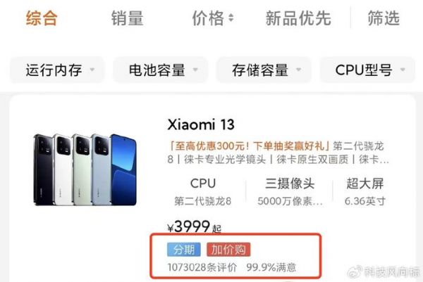 小米13已经卖了多少台?对于这个问题,虽然官方没有公布,但可以简单预估下,其在小米商城评价数量超过100万,京东评价数量超过20万,一般来说评价和销售数据的比例可以达到1:3的比例,也就是说小米13卖了360万台左右应该没有压力。