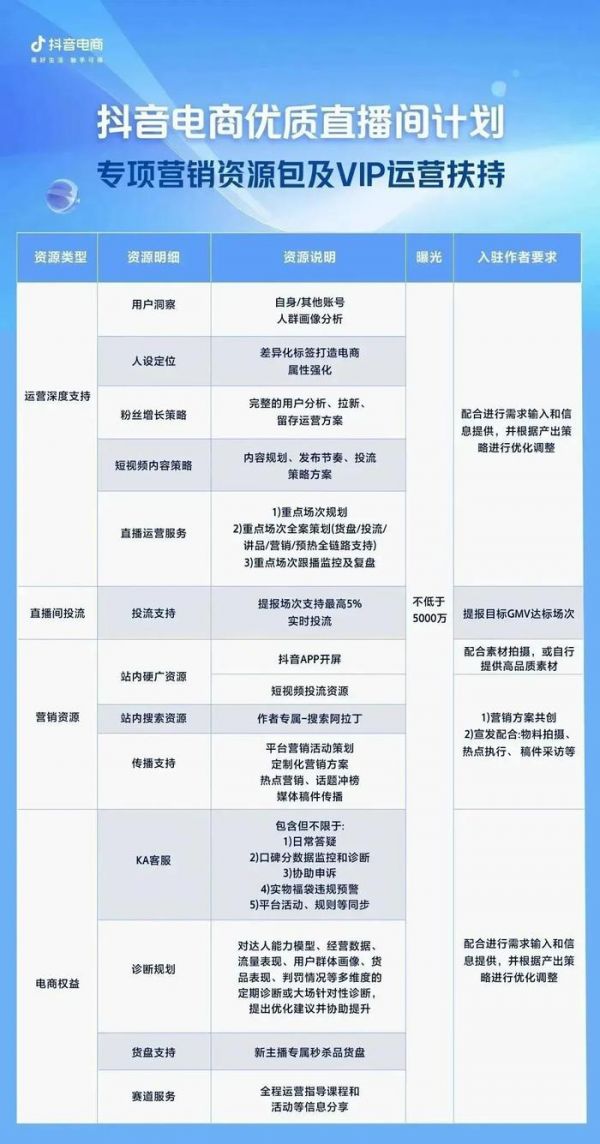 具体来看,抖音电商的资源扶持主要包括了运营支持、直播间投流、营销资源和电商权益四大项,帮助优质直播间作者在寻找人设定位、分析用户画像、规划内容方案、提供站内广告与搜索资源等具体操作层面培养能力,从多维度助力高品质直播间。