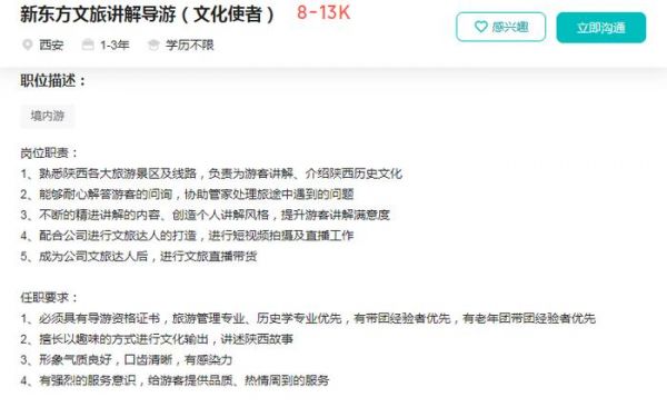 图片来源:招聘网站以某招聘网站上发布的“文旅讲解导游”一职为例,该岗位工作地点位于陕西,工作职责包括熟悉陕西各大旅游景区及线路,为游客讲解、介绍陕西历史文化;不断精进讲解内容、创造个人讲解风格;配合公司进行文旅达人的打造,进行文旅直播带货等。任职资格则必须具有导游资格证书,旅游管理专业、历史学专业优先,有老年团带团经验者优先,薪资水平为8000-13000元/月。