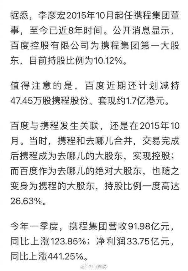 #李彦宏已辞任携程集团董事职务# 携程发布公告:李彦宏辞任董事!已任职近8年,百度作为携程第一大股东,目前持股比例为10.12%。