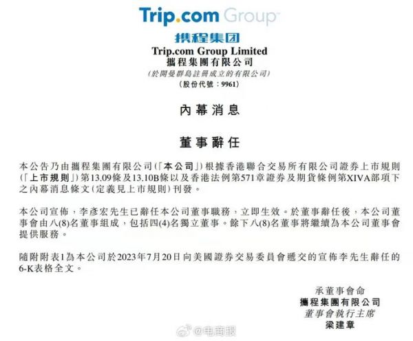 携程发布公告:李彦宏辞任董事!