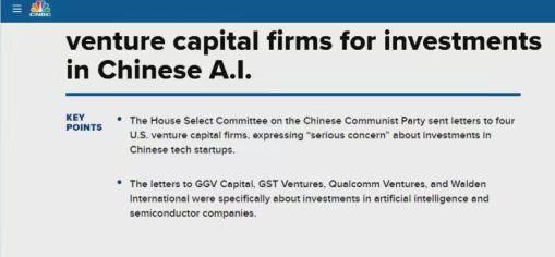 美国消费者新闻与商业频道CNBC7月19日报道称,美中战略竞争特别委员会本周分别致函纪源资本、金沙江创投、华登国际以及高通公司旗下投资业务部门高通创投等四家美国风投公司,对它们在中国科技创业公司的投资表示“严重关切”,要求这些公司提供对中国人工智能、半导体和量子公司的投资信息,并在7月26日之前作出回应。