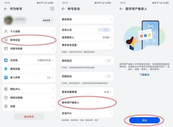 首先,继承人和被继承人都要有华为账号,并且经过了实名验证。之后在华为账号里选择账号安全-数字资产继承人-添加,就能看见添加继承人的页面了。按照要求添加继承人的账号信息,就完成了第一步。