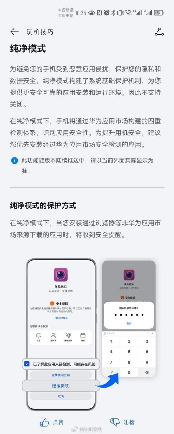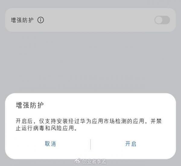 当关闭这个模式之时,用户又可以通过第三方进行软件安装。这个模式可以提供更安全的应用服务以保护用户的权益,因为在该模式下,仅支持安装符合《华为终端质量检测和安全审查标准》的应用。