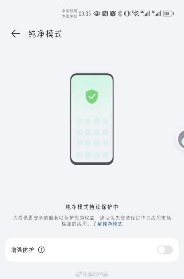 鸿蒙的纯净模式是一种增强防护功能,开启之后,系统仅支持安装经过华为应用市场检测的安全应用,并禁止运行病毒和风险应用。这种增强防护很适合没有什么辨别能力的小孩或老人,不用担心点错下错有问题的应用。