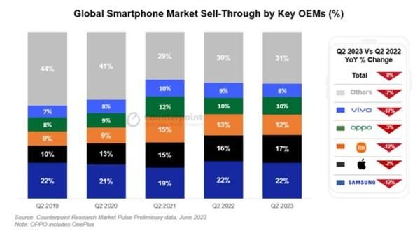 【手机中国】近些年来,全球的智能手机市场可以说是风云变幻,甚至一度出现了两极分化的局面。不过到目前为止,一直有一个主旋律——跌。根据Counterpoint Research最新报告,全球智能手机市场已经出现连续八个季度下滑的局面,2023年第二季度,全球智能手机销量年同比下降8%,环比下降5%,理想当中的市场回暖情况并没有出现。