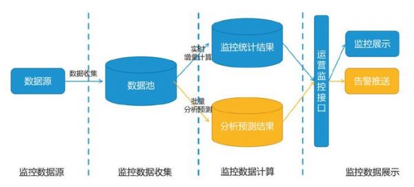 4.监控数据展示。主要负责对监控数据进行大屏展示,供运维人员实时监控系统健康状态,通过告警推送(包括多告警源接入、告警设置、告警通知等功能),及时提醒运维人员处理系统问题。