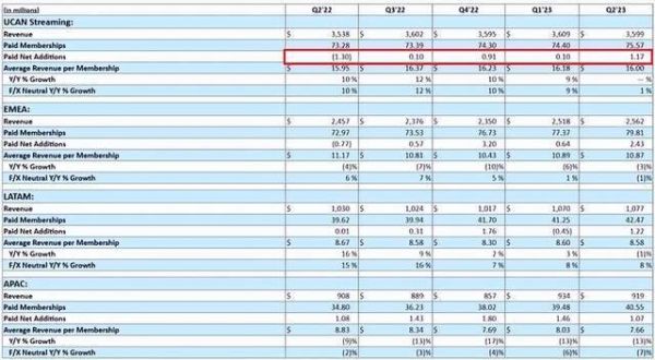 图/Netflix2022年Q2至2023年Q2分区域用户增长情况