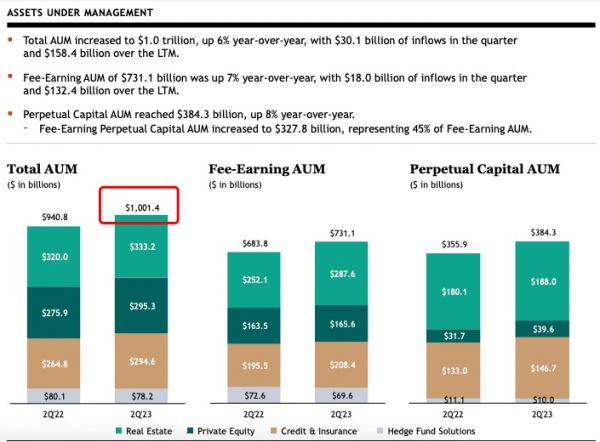 如此一来,黑石缔造了极具里程碑意义的一幕——由于一致推动保险、基础设施、信贷和某些类型的房地产等低风险、低回报策略,黑石的总资产管理规模从第一季度末的9913亿美元和去年同期的9408亿美元攀升至今年第二季度的1万亿美元。