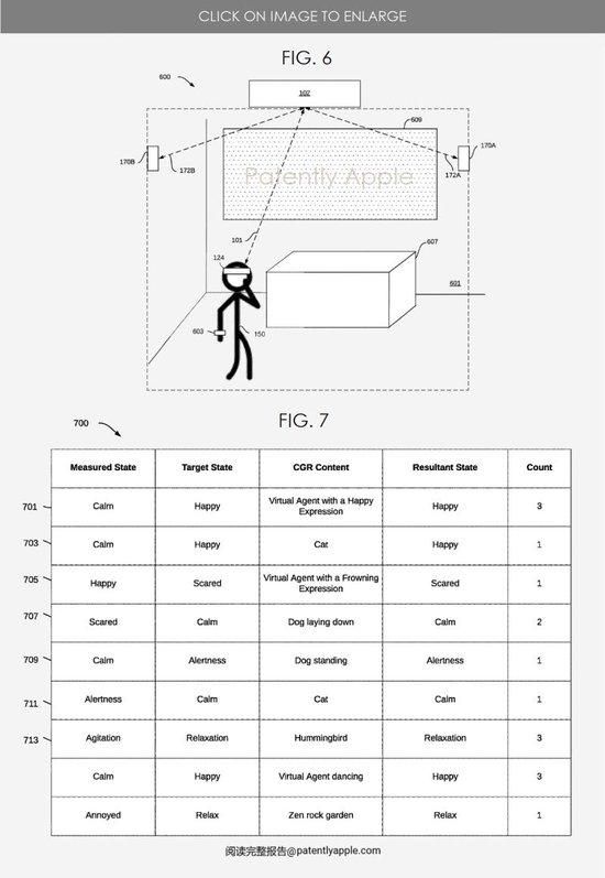 在苹果专利图 6 中,苹果描述了未来的 HMD(Apple Vision Pro)与各种家庭服务器一起工作,在某些情况下是 iCloud 来控制用户体验。Vision Pro 可以使用传感器和眼动追踪来了解用户的心理状态。在图 7 中,我们看到“用户模型 #700”,它被配置为提供投射反应。换句话说,用户模型包括历史信息,其中包括过去用户状态数据,如测量状态、目标状态、结果状态和查看特定 CGR 内容时的修改 CGR 内容,以便将修改后的 CGR 内容与用户的投射反应相关联。