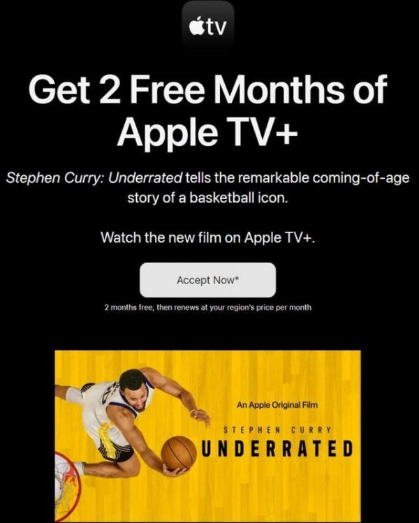 为推广个人纪录片电影 库里为球迷提供Apple TV两个月免费试用期