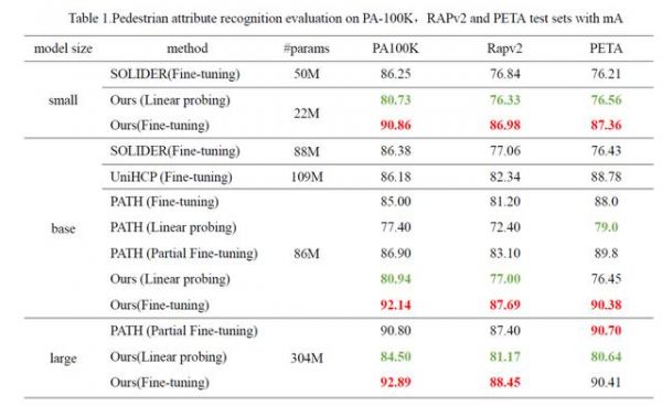 其中最高在PA100K上的Fine-tuning准确率达到92.89%,比SOTA高出5.2个点,四个数据集所涉及的范围覆盖人体全局属性(性别、年龄),局部属性(穿戴风格、配饰),携带属性(手机、刀棍、手提包等)、人-物交互HOI(抽烟,持刀棍,手机拍屏幕)等。