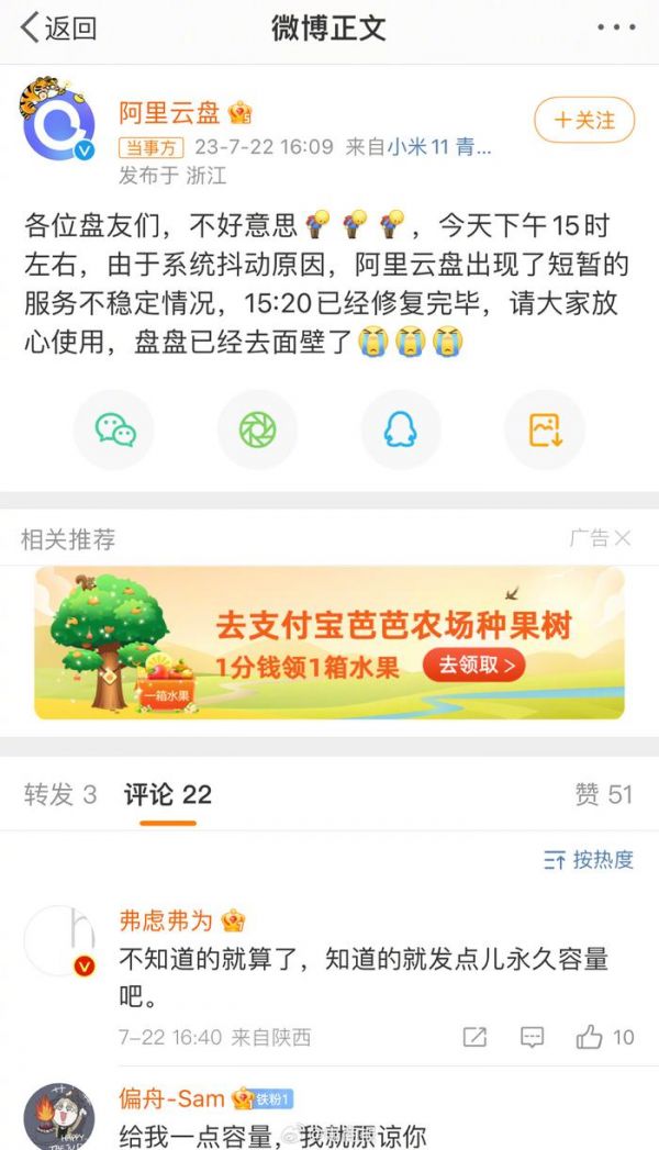 #阿里云盘出现故障# 阿里云盘短暂宕机,无法访问和加载内容。官方回应:因系统抖动导致服务不稳定,已修复。