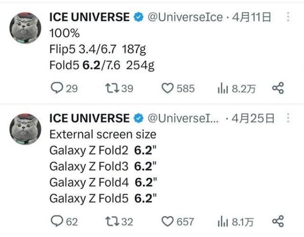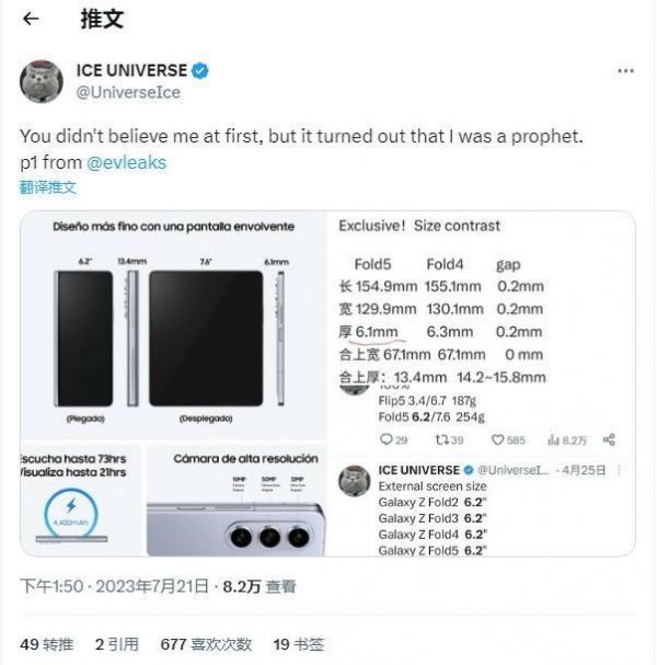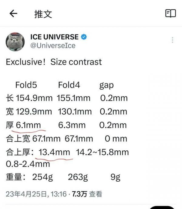 不过,另一位消息源@i冰宇宙分享了三星Galaxy Z Fold5的相关信息,并在此提供了截图。根据截图显示,三星Galaxy Z Fold5手机的外屏尺寸为6.2英寸,展开后的内屏尺寸为7.6英寸。在折叠状态下,手机厚度为13.4毫米,展开状态下厚度为6.1毫米。