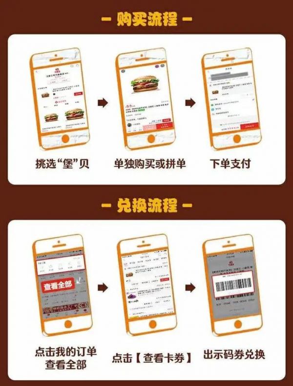 购买方式,与在拼多多上购买其他电商商品的流程相同,可以单独购买,也可以拼团。以购买汉堡王的电子兑换券为例,拼团并支付成功后,即可在拼多多的全部订单内查看卡券,然后到店对卡券进行核销即可。