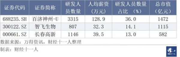 表10:A股市值最高的三家生物医药公司研发人员年收入情况