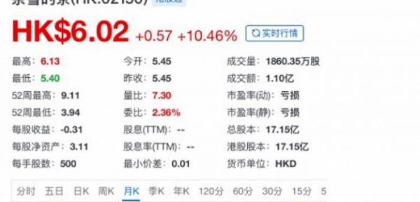 消息一出,奈雪股价应声上涨。当日股价报收6.02港元/股,涨10.46%,总市值为103.25亿港元。