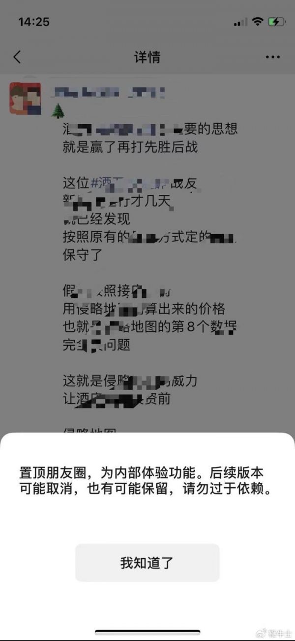 根据网上信息显示,这一朋友圈置顶功能最早在今年4月份就已有用户获得资格,近期可能逐渐开始扩大测试范围。