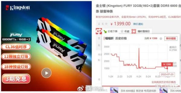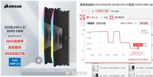 这样的国产D5并不比国外品牌同级内存差,价格优势也很明显。去东哥家看,都是DDR5-6800 16Gx2的游戏内存套条,光威神策839,海盗船1049,金士顿要1399,截图如下。